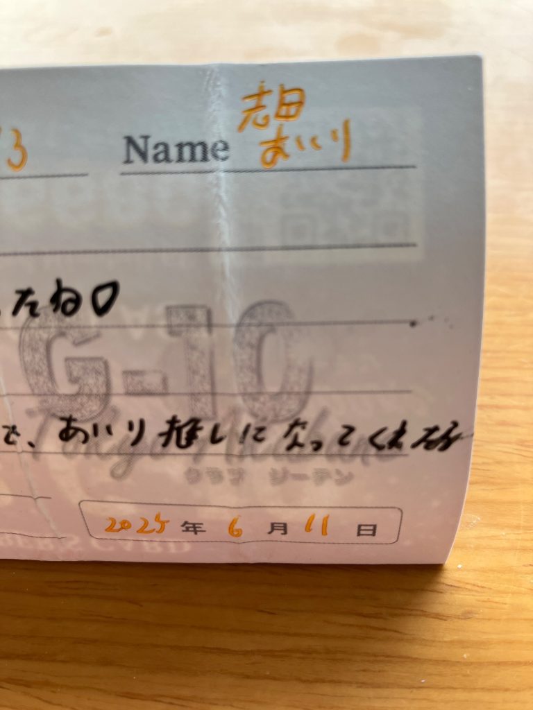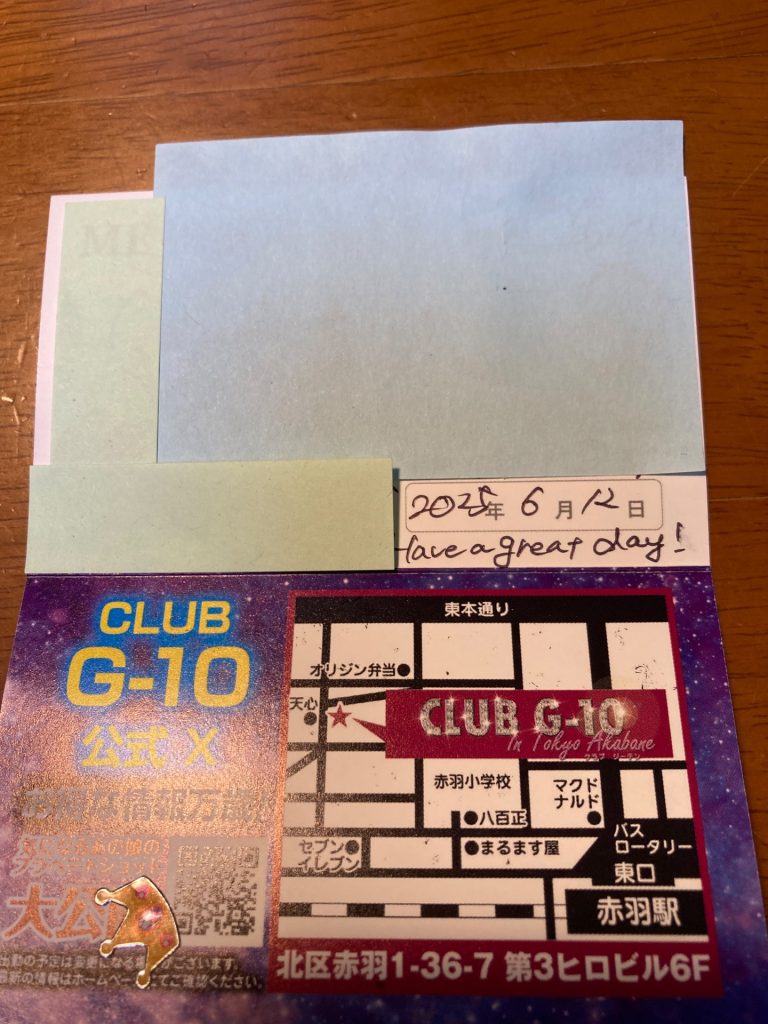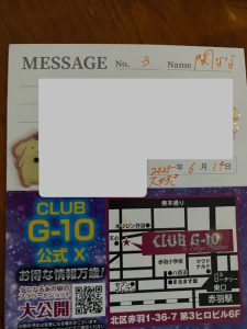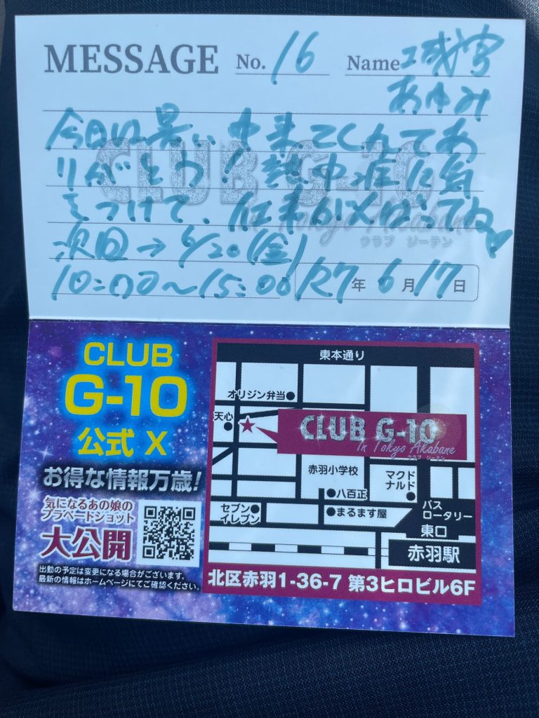 でも本指名で会おうと、名刺のコメント通りに6/20に行ったところ、城宮さんはお休みとのことでした⤵︎