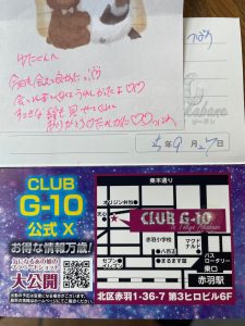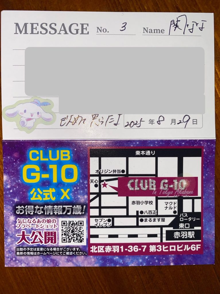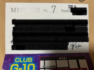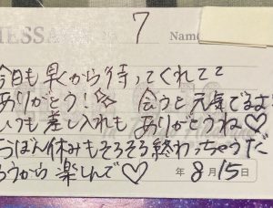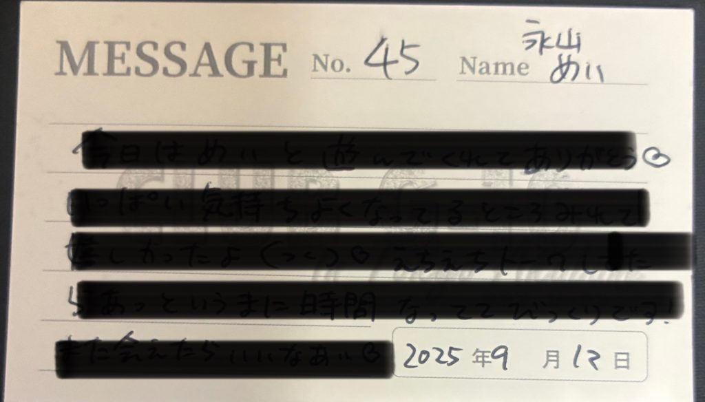 プレイ終了後も名刺にはびっしりとコメントを書いてくれました。是非ともまた、指名をしたいなと思わせてくれる女の子でした。またよろしくお願いします。
