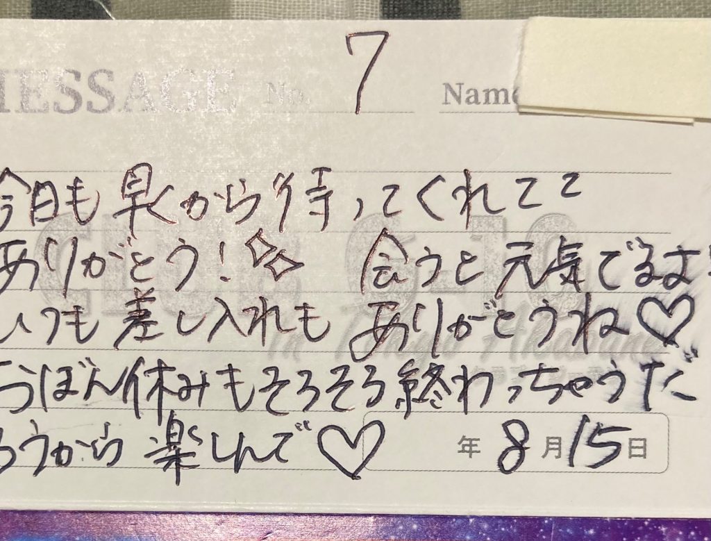 毎日の日課に好きな推しの日記をチェックしていたら心配そうなので思い切って平日に有給を取り朝から並んで整理券をもらって順番待ち一時間位待ちましたが