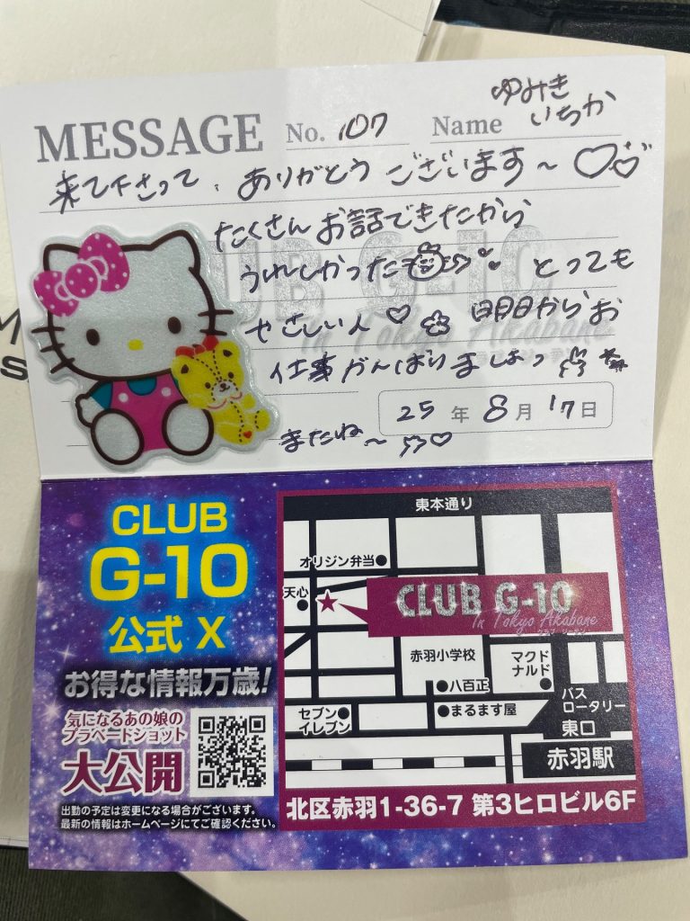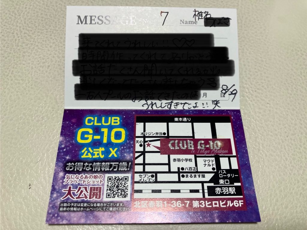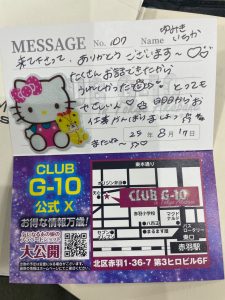 それだけで大興奮色々あった後、だっそうなんですが(久しぶりに会えて嬉しいよー)お店に居るだけで嬉しいし又行と思う今現在G-10にいる女性の仲でただ1人の推しです。それとは別に